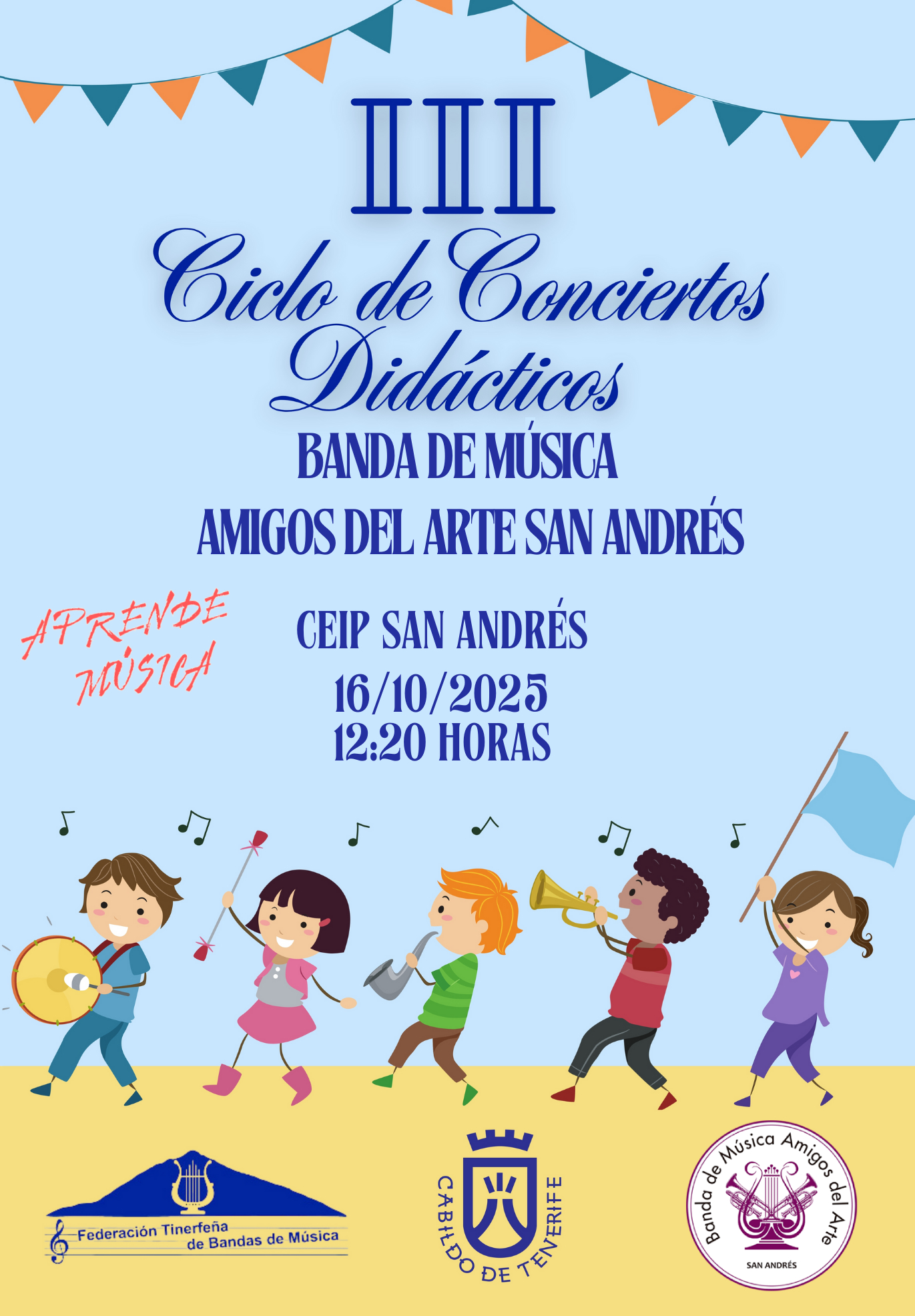 III Ciclo Conciertos Didácticos por admin · 25 septiembre, 2025 Llega el III Ciclo de Conciertos Didácticos de la Banda de Música Amigos del Arte de San Andrés. Lugar: CEIP San Andrés. Día: 16 de octubre de 2025 a las 12:20 horas. ¡Te esperamos!